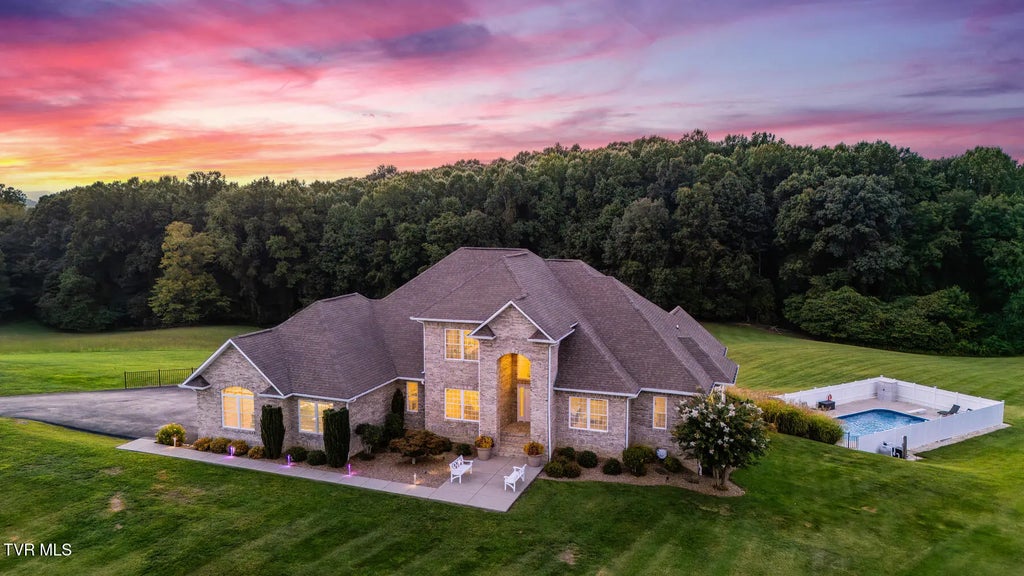 Luxury Home in scenic Bristol, Virginia - a custom-built luxury home with sweeping views of the Holston Mountains, just minutes from the Virginian Golf Club, South Holston Lake, and the Bristol Casino. Set on 5.23 acres of gently rolling land, this thoughtfully designed home offers 3 bedrooms, 4 bathrooms, and the flexibility of a dedicated office with closet storage—perfect as a home office or optional fourth bedroom. Inside, you'll find a gourmet kitchen with Jenn-Air appliances, granite countertops, a gas range, and walk-in pantry. The formal dining room and open-concept great room with tall ceilings and fireplace provide an ideal space for entertaining. A striking iron stairway leads to two upstairs bedrooms, while the main-level private suite includes a spa-like bathroom and walk-in closet. Enjoy peaceful mornings in the bright sunroom, or head downstairs to a spacious basement den featuring a bar, pool table, recreation space, and plenty of room for game night or relaxing. The home also includes a 3-car garage plus a heated and cooled basement garage—ideal for a workshop, storage, or extra vehicle space. Outdoors, your private oasis awaits with an 18x36 heated pool and panoramic mountain views. This rare Bristol VA home combines luxurious features, flexible space, and an unbeatable location near top area amenities.