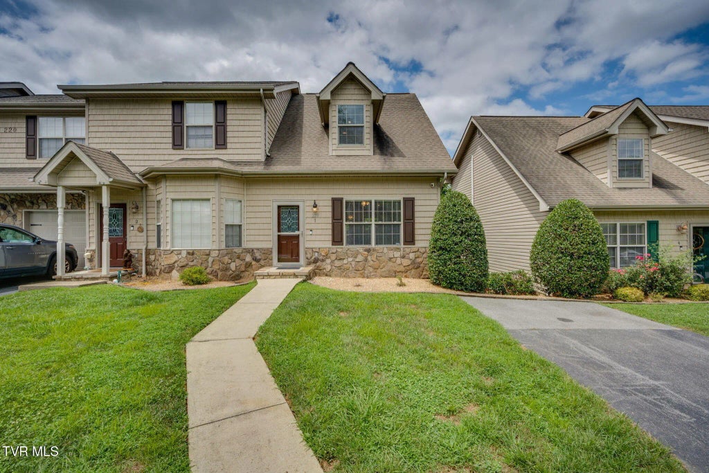 Nestled in the highly sought-after Stonebriar community, this tastefully updated 2-bedroom, 1.5-bathroom condo offers the perfect blend of modern comfort and unparalleled convenience. Ideally situated less than two minutes from essentials like grocery stores, dining, urgent care, and gyms, you're also just minutes from I-26 and the Tri-Cities Airport. Step inside to discover a fresh, inviting atmosphere, boasting new paint throughout, upgraded lighting, fans, and fixtures, and sleek modern black hardware, along with a hardwired Ring security camera system for added peace of mind. The main floor features rich, dark-toned flooring flowing seamlessly from the front door through the open-concept living area to the kitchen, showcasing updated black stainless steel appliances against crisp white cabinetry and granite countertops with elegant beveled edges. Upstairs, the spacious primary suite is a true sanctuary with dramatic cathedral ceilings and abundant natural light from two large windows offering a pleasant view of the surrounding greenery, complete with a sleek upgraded ceiling fan. Its ensuite bathroom features a double vanity and a shower-tub combination elegantly trimmed with new black hardware, along with a large walk-in closet and a cozy windowed nook. The main floor living area extends to a private covered balcony, an outdoor oasis featuring an updated ceiling fan, charming decorative string lights, a retractable sun shade, and a serene, lush view of the natural surroundings. The versatile layout includes an additional room downstairs, perfect for a home office, media room, or guest bedroom, providing true multi-functionality, and a spacious one-car garage with the added benefit of additional covered parking under the back balcony. This meticulously updated home offers an exceptional living experience and is truly a must-see that won't last long. - Buyer to verify all information. Listing agent is also the owner of the property.