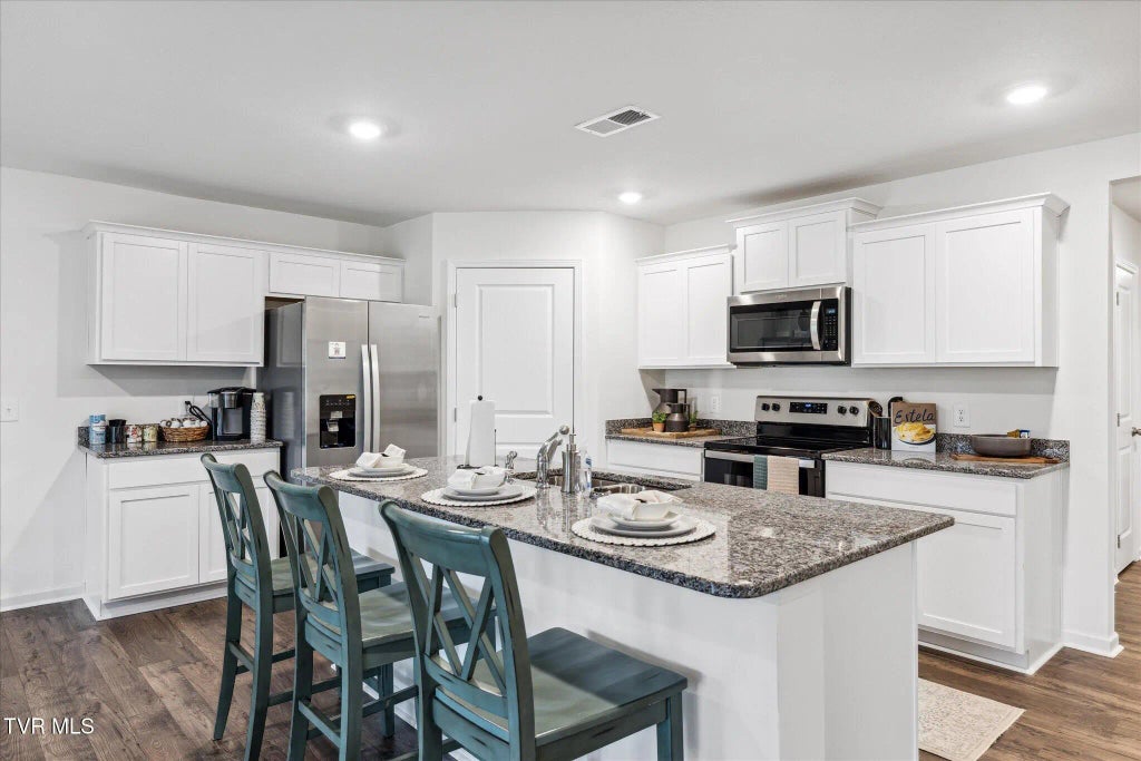 The Cali floorplan is available in the Saint Andrews Garth in Kingsport, TN. This single-story layout optimizes living space with an open concept kitchen overlooking the living area, dining room, and covered patio. Entertaining is a breeze, as this popular home features a spacious kitchen island and kitchen pantry for extra storage. The primary bedroom is located off the living space in the back of the home for privacy. The primary bedroom also includes a walk-in closet with a spacious bathroom. At the front of the home, there are two additional bedrooms and a second full bathroom. Across the hall is a fourth bedroom. This home features a space to fit all your needs. Tradition Series Features include 9ft Ceilings on first floor, Shaker style cabinetry, Solid Surface Countertops with 4in backsplash, Stainless Steel appliances by Whirlpool, Moen Chrome plumbing fixtures with Anti-scald shower valves, Mohawk flooring, LED lighting throughout, Architectural Shingles, Concrete rear patio (may vary per plan), & our Home Is Connected Smart Home Package. Seller offering closing cost assistance to qualified buyers. Builder warranty included. See agent for details. Due to variations amongst computer monitors, actual colors may vary. Pictures, photographs, colors, features, and sizes are for illustration purposes only and will vary from the homes as built. Photos may include digital staging. Square footage and dimensions are approximate. Buyer should conduct his or her own investigation of the present and future availability of school districts and school assignments. *Taxes are estimated. Buyer to verify all information.